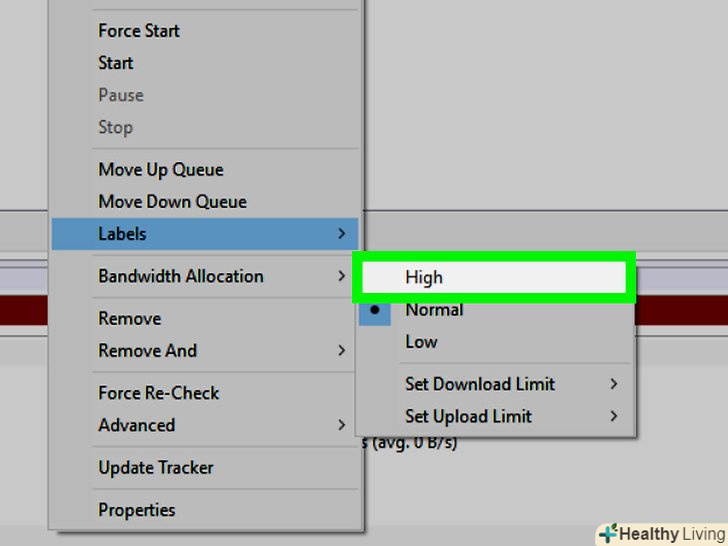 Змініть пріоритет швидкості певного файлу. якщо ви завантажуєте відразу кілька файлів, змініть пріоритет швидкості конкретного файлу на "високий", щоб він завантажувався швидше, ніж інші файли:- Клацніть правою кнопкою миші по торрент-файлу;