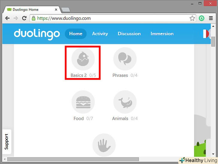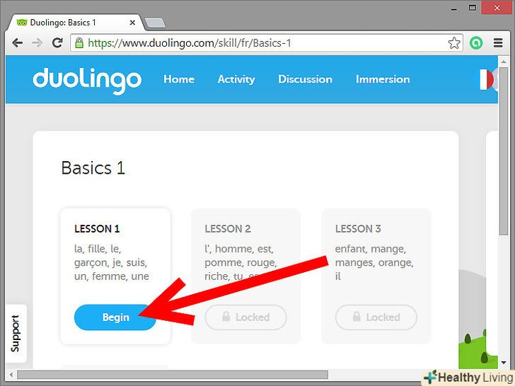Натисніть на урок. всередині кожного блоку навичок є кілька уроків. Натисніть на перший, щоб почати роботу. Ви починаєте з чотирьох сердець (які пізніше перетворяться на три, коли ви прогресуєте у вивченні мови). Кожен раз, коли ви відповідаєте на питання неправильно, ви втратите серце. Мета полягає в тому, щоб пройти урок, зберігши серця. Ось різні типи питань, які можуть зустрічатися на уроках:- Словник: вам покажуть зображення предмета і попросять назвати його.