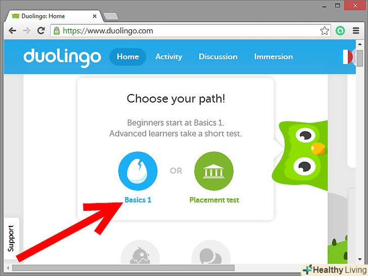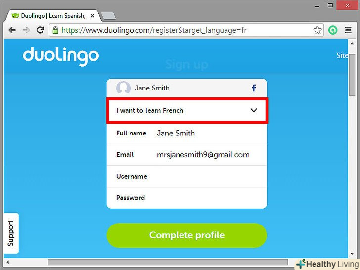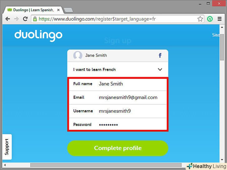 Зареєструйтеся через Facebook або електронною поштою. при відвідуванні головної сторінки Duolingo вам буде запропоновано зареєструватися одним з двох способів.- Якщо ви вирішите зареєструватися по електронній пошті, ви можете прив'язати свій аккаунт на Facebook до Duolingo пізніше.