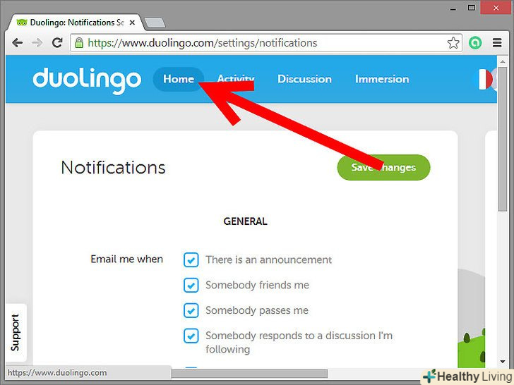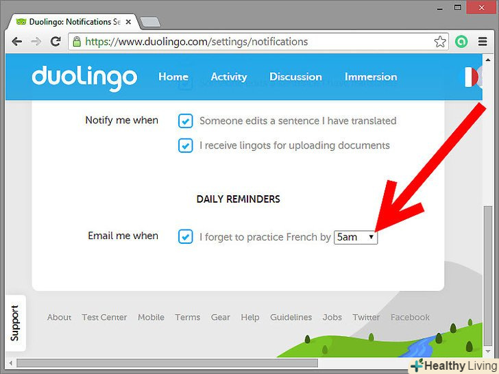 Встановіть нагадування. Duolingo працює найкраще, коли ви тренуєтеся кожен день, хоча про це можна легко забути. Налаштуйте щоденні нагадування, щоб тренувати свій словник, не вибиваючись з графіка.- Перейдіть на вкладку "Повідомлення" (Натисніть на значок шестерінки в правому верхньому куті, потім виберіть Налаштування).