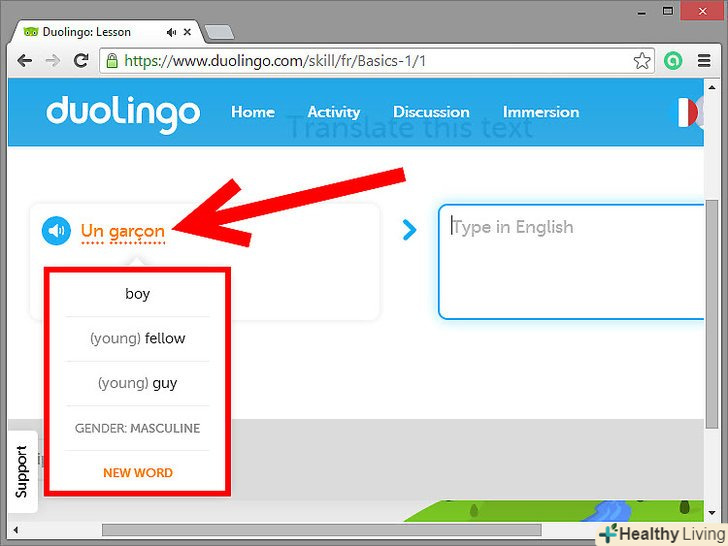Перекладіть речення. натисніть пропозицію, виділену сірим. З'явиться текстовий блок, де ви можете ввести свій переклад і набрати більше очок.- Якщо ви не впевнені в слові, наведіть на нього курсор. Duolingo забезпечить кілька варіантів.