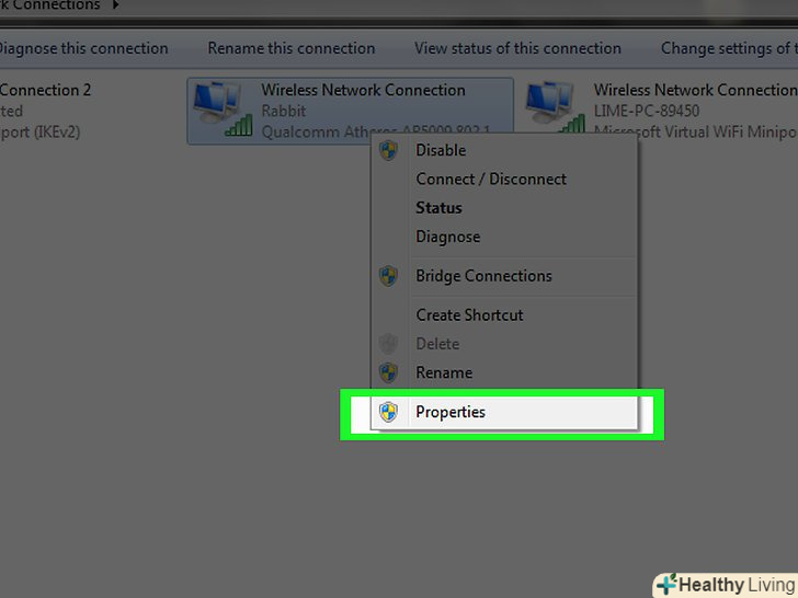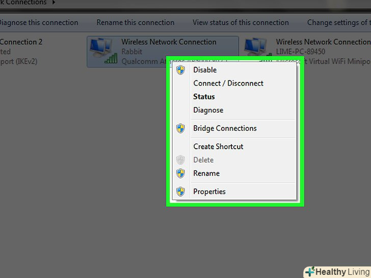 Клацніть правою кнопкою миші на ім'я активного підключення до інтернету. ви знайдете його у верхній частині вікна "мережеві підключення".