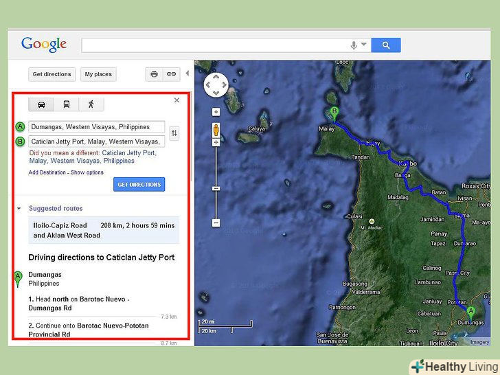 Отримайте напрямки.клікнувши по будь-якому місцю на карті, ви отримаєте дані про нього. За допомогою посилань "Прокласти маршрут сюди" і "прокласти маршрут звідси", ви зможете прокласти маршрут, вказавши при цьому більш точні пункти відправки і призначення, а також тип транспорту в меню зліва.- Ви побачите приблизний час у дорозі.