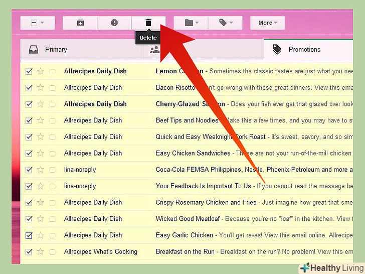 Видаляйте непотрібні повідомлення.Гугл надає просто купу файлового простору, але, якщо ви хочете навести порядок і звільнити трохи місця, то просто видаліть непотрібні емейли. Виберіть їх і натисніть на ярлик "кошик". Через 30 днів ці емейли зникнуть назавжди.