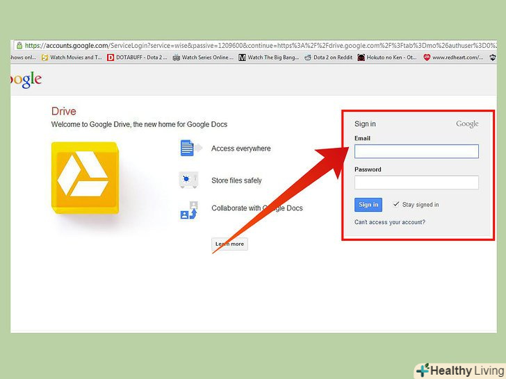 Відкрийте Google Drive.зробити це можна через верхнє меню. Даний сервіс прийшов на зміну Google Docs, але багато в чому зберіг його функціонал. Ви точно так само можете створювати файли, змінювати їх і відправляти іншим людям, а також зберігати там файли зі свого комп'ютера.- Все, що для цього потрібно - авторизуватися. Google Drive безкоштовний.