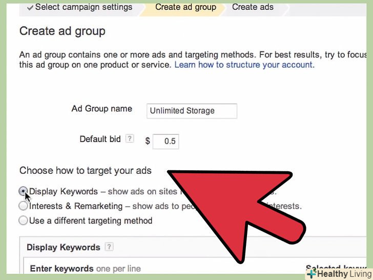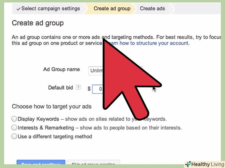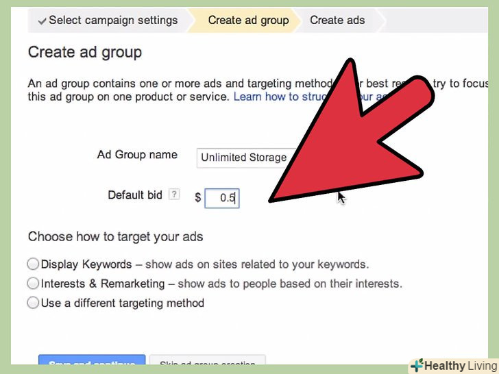 Зробіть свою ставку. Adwords за замовчуванням налаштований на те, щоб ви отримали якомога більше кліків за відведений бюджет. Втім, завжди можна переключитися в режим ручного виставлення ставок.- Автоматичне виставлення ставок може насторожити когось, але в цілому ця опція себе виправдовує. Google намагається дати вам можливість використовувати свої гроші на повну котушку.