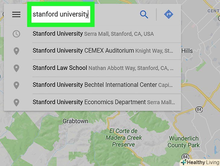 Знайдіть потрібне місце на карті. для цього скористайтеся рядком пошуку (в лівому верхньому кутку) або натисніть на «+» або «-» (в нижньому правому куті), щоб змінити масштаб карти.- Орієнтація Google Карт не різниться в режимах "супутник" і» Карта": північ завжди знаходиться вгорі екрану, а південь — внизу.