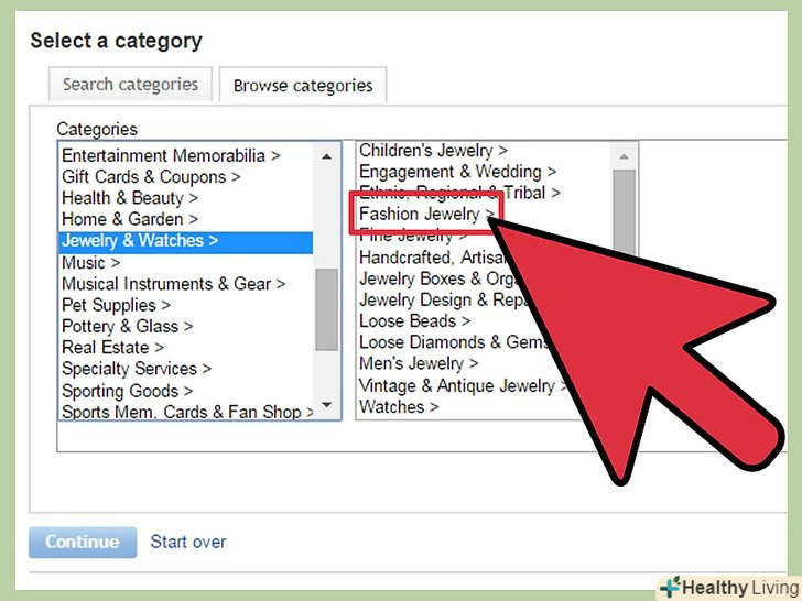 Визначтеся з категорією, яка найбільш точно описує предмет, який ви продаєте. виберіть «Jewelry amp; Watches» (прикраси amp; годинник), а потім вкажіть категорії, обмежуючи їх під виставляється на продаж товар. Після закінчення вибору категорії натисніть на кнопку "Continue" (Продовжити).
