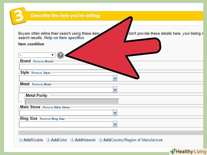 Заповніть інформацію в пунктах «Title» (Заголовок), «Condition» (стан) і «Item specifics» (специфічні характеристики товару). при написанні заголовка використовуйте ключові слова, які покупець може ввести в пошуковому запиті. Надайте якомога більше інформації в розділі "Item specifics" (специфічні характеристики товару), тому що таким способом покупці зможуть звузити область пошуку, щоб знайти ваш лот.