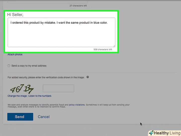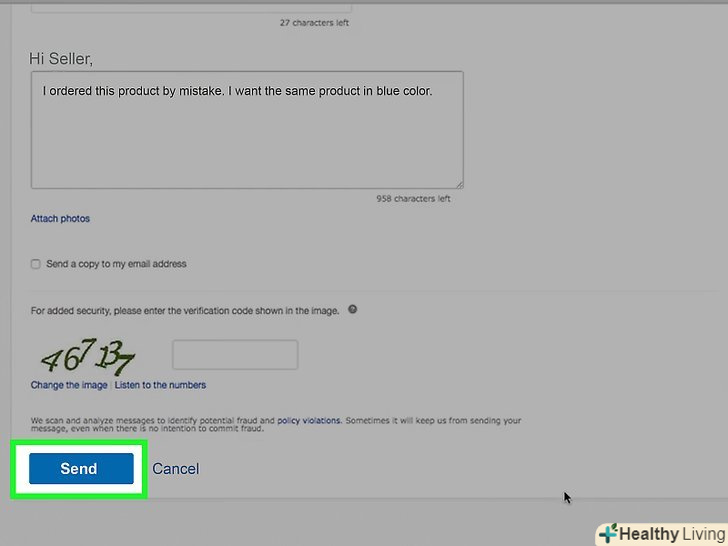 Клацніть поВідправити . запит буде відправлений продавцю. Угода на eBay є юридично зобов'язуючим договором. Майте на увазі, що продавець не зобов'язаний погоджуватися на скасування покупки.- Якщо скасувати покупку не вийшло, подайте заявку на відшкодування коштів, як тільки отримаєте товар.