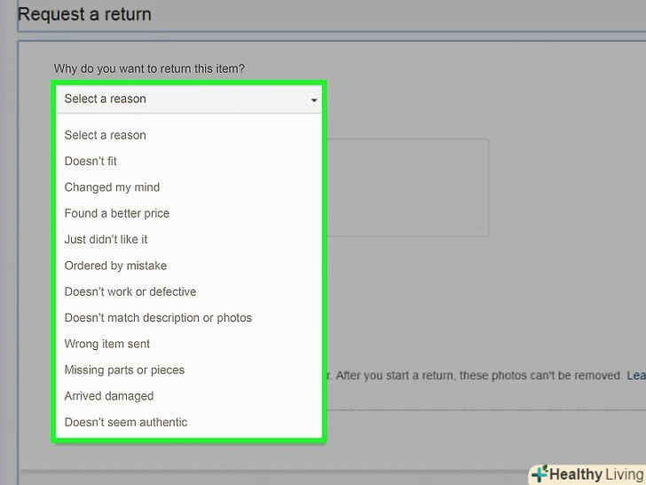 Виберіть причину повернення. для цього встановіть прапорець у відповідної причини. Якщо ви отримали не той товар або він зламаний, виберіть цей варіант. Якщо ви передумали купувати товар, виберіть відповідну опцію.- Якщо товар несправний або пошкоджений, до запиту про відшкодування можна прикріпити до 10 фотографій.