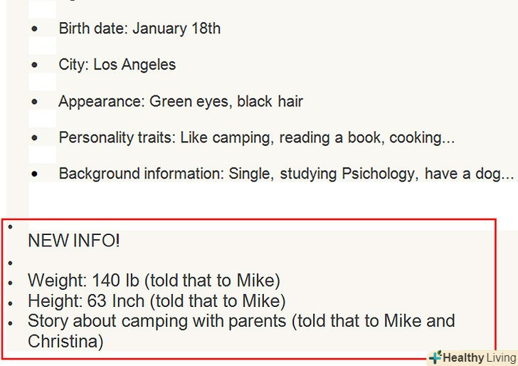 - Якщо ніхто не знає про невеликі деталі вашого особистого життя, використовуйте їх для створення підробленої особистості. Таким чином, вам буде легше їх запам'ятати і не доведеться нічого придумувати.