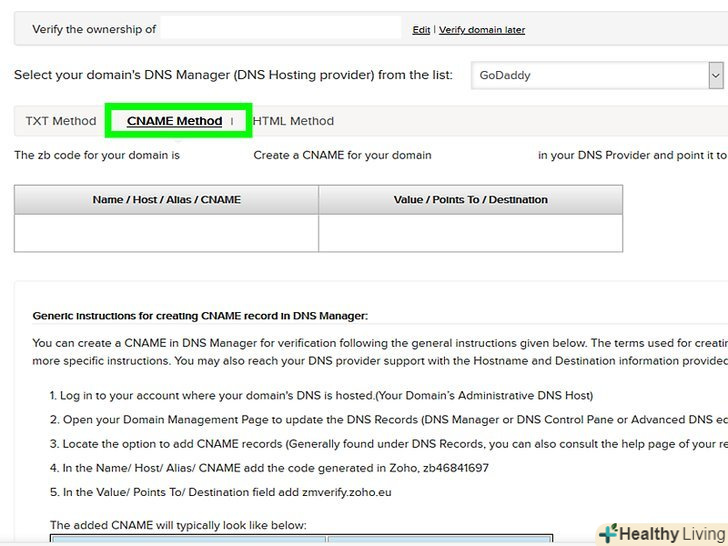 Клацніть по вкладціCNAME Method (CNAME-метод). вона знаходиться у верхній частині сторінки. Це найпростіший спосіб перевірити веб-сайт.