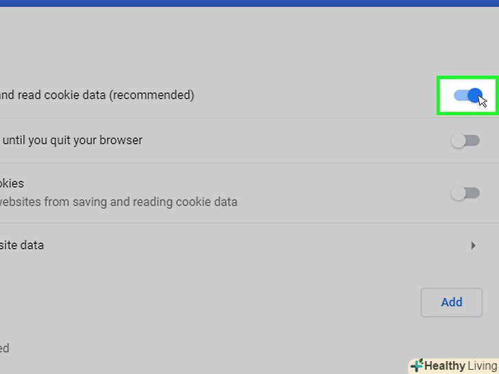 Натисніть на сірий повзуноку " дозволити сайтам зберігати і читати файли cookie (рекомендується)». він стане синім. Так ви дозволите браузеру використовувати куки.