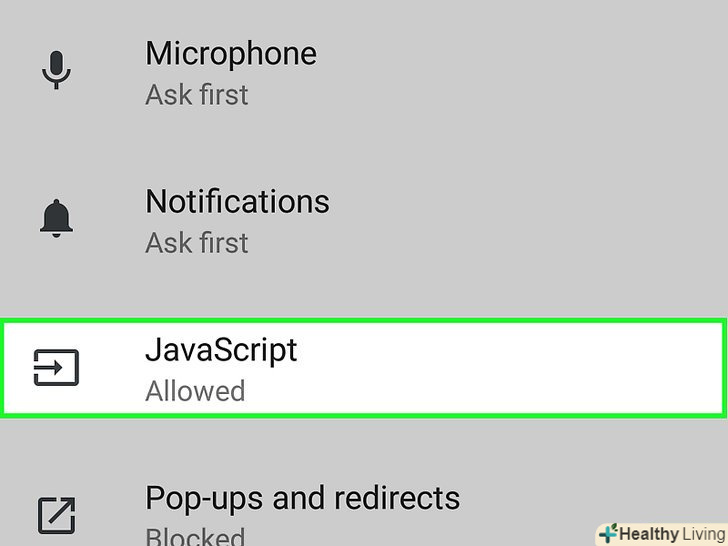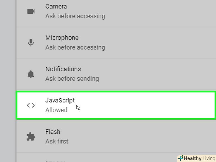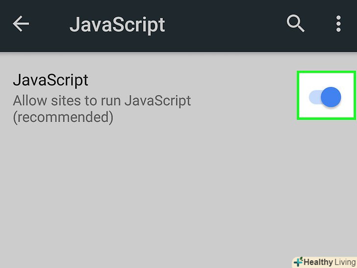 Натисніть на сірий повзунок у " JavaScript». він переміститься вправо і стане синім або зеленим