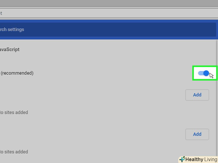 Активуйте JavaScript. натисніть на сірий повзунок у «дозволено (рекомендується)». Перемикач стане синім.- Якщо цей перемикач синій, JavaScript вже включений.