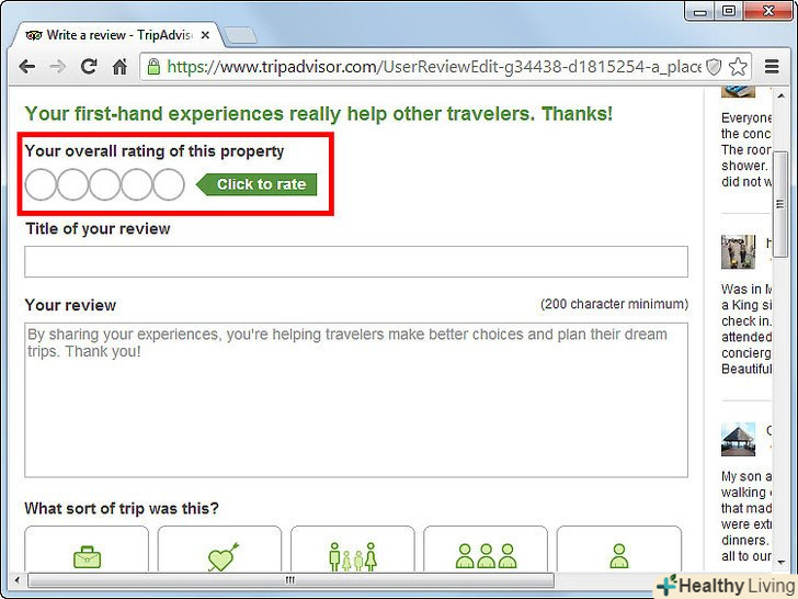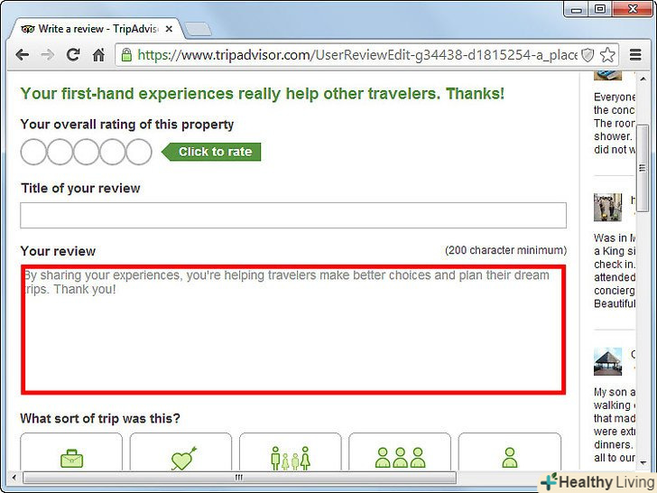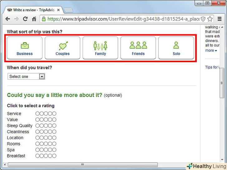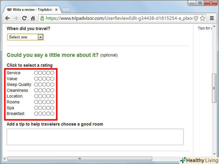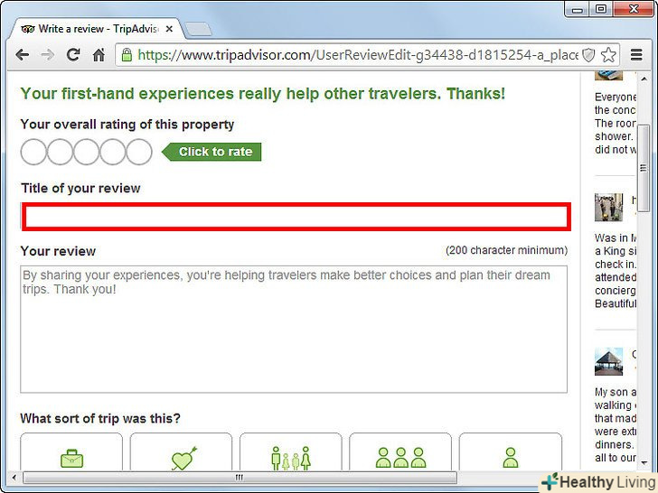 - Якщо ви створюєте відгук про готель, то подумайте про те, щоб залишити пораду про кімнати. Прикладом ради про кімнату може бути наступне:" кімнати на другому поверсі тихіше, ніж інші "і" якщо хочете виспатися, то не бронюйте кімнату на першому поверсі."Ви можете це зробити, залишаючи пораду під" Add a tip to help travelers choose a good room."