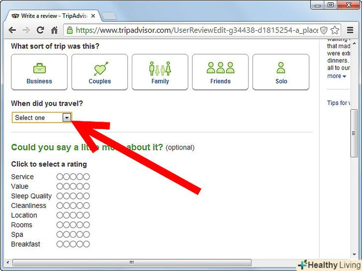 Виберіть місце, про яке бажаєте залишити відгук. це може бути Готель, Будинок відпочинку, пам'ятка або ресторан. Щоб це зробити, використовуйте ключові слова в полі пошуку і виберіть потрібне місце. Після цього, клікніть на " Write a Review."- Якщо ви не можете знайти потрібне місце, то можливо ви допустили помилку в назві, в назві міста, або дане місце відсутнє в списках TripAdvisor. Якщо дане місце не присутній на веб-сайті, то повідомте TripAdvisor і вас сповістять поштою, коли відгук буде прийнятий.