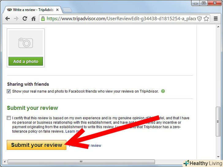 Коли ви закінчите, клікніть на "Submit your review". Якщо ви хочете зробити перед огляд вашого відкликання, то клікніть на "Preview your review."- Не забудьте встановити галочку на поле, яка підтверджує ваше розуміння того, щоTripAdvisor не визнає підроблені відгуки та коментарі. іншими словами, якщо ви напишіть підроблений відгук про місце, яке ви не відвідали, то у вас будуть неприємності.