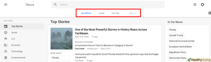 Виберіть розділ. виберіть Заголовки, місцеві новини або добірку новин відповідно до ваших інтересів у верхній частині сторінки. Натисніть на кожен розділ, щоб дізнатися про свіжі новини.