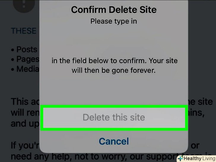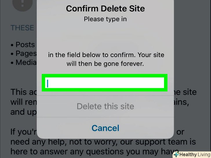 ТоркнітьсяОстаточно видалити сайт . це червоний рядок під текстовим полем. Натисніть на цю опцію, щоб назавжди видалити свій блог з WordPress.- На Android потрібно просто натиснутиВидалити .