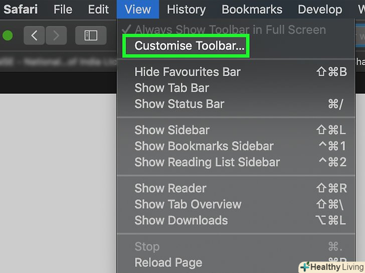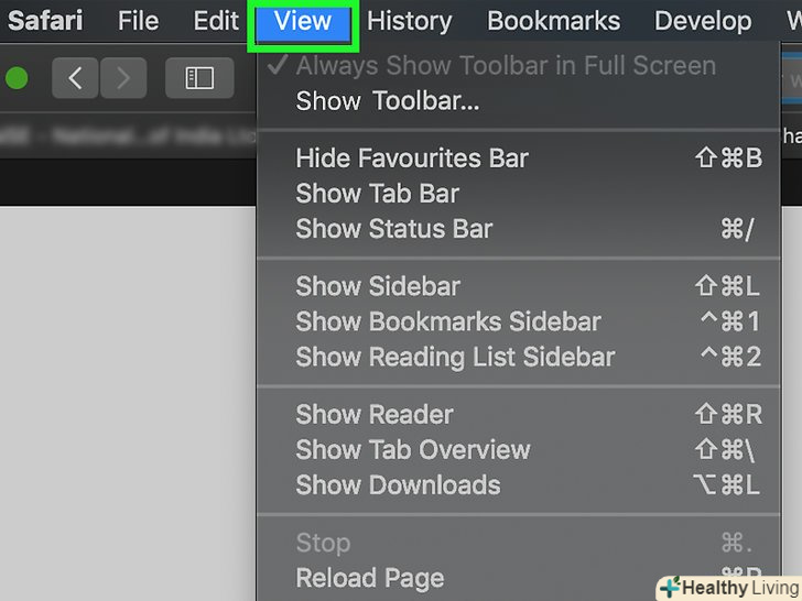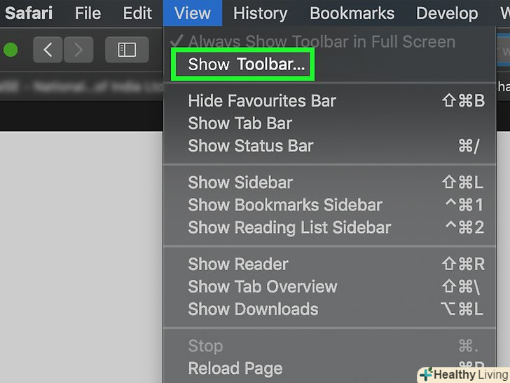 - Якщо Safari вже запущений і знаходиться в повноекранному режимі, наведіть вказівник миші на верхню частину екрану, а потім натисніть на відобразився зелене коло у верхньому лівому кутку екрану.