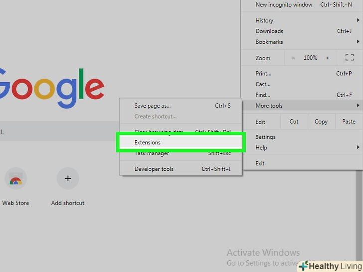 Клацніть поРозширення . ви знайдете цю опцію в новому меню. Відкриється сторінка "Розширення".- У Chrome панелі інструментів є розширеннями, тому на сторінці "Розширення" можна ввімкнути панелі інструментів.