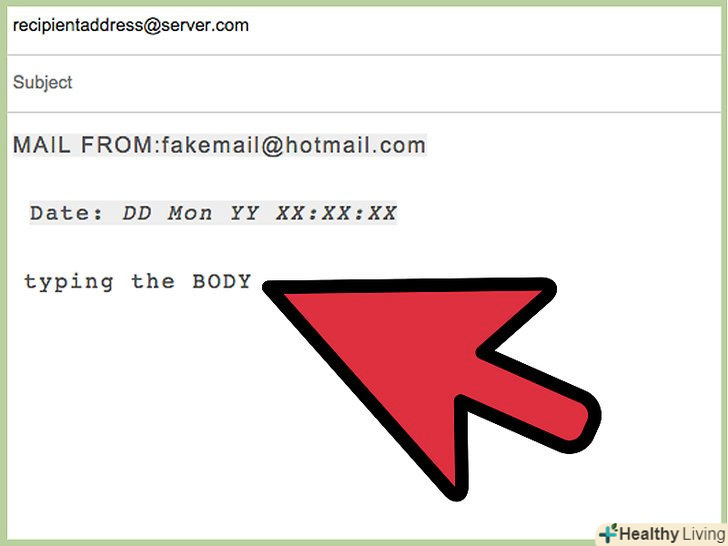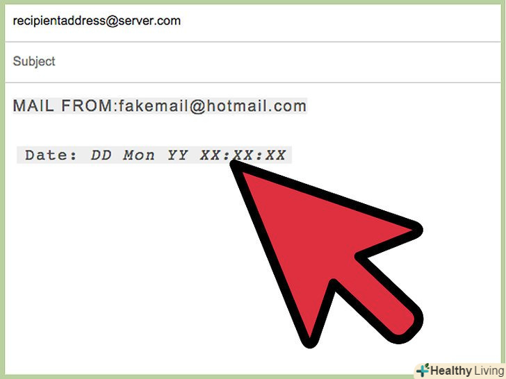 Створіть фальшивий заголовок. він відображається у верхній частині листа, який отримає адресат. Введіть наступні команди, замінивши дані відповідною інформацією:- Введіть Date: DD Mon YY XX:XX:XX і натисніть ↵ Enter . Замінивши DD Mon YY XX:XX:XX відповідною датою. Наприклад, Date: 17 Jun 07 12:24:13