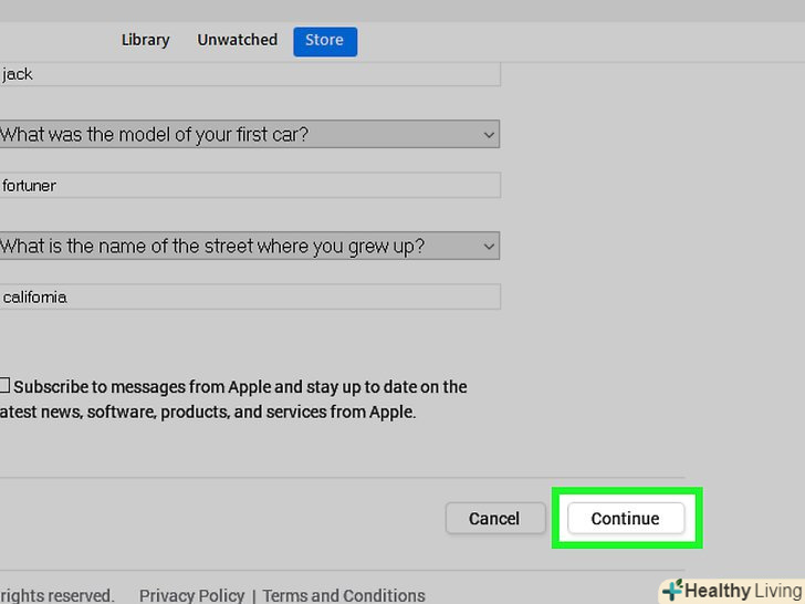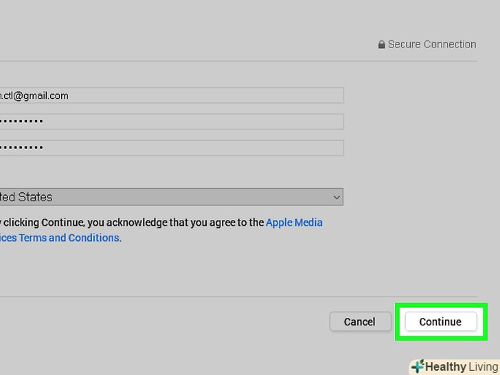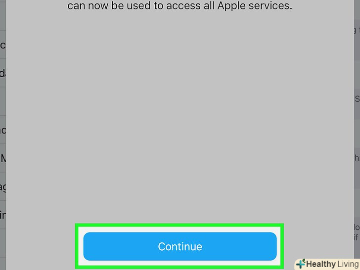 Клацніть поПродовжити . ця кнопка знаходиться в нижньому правому куті вікна. Якщо ви ввели вірний код, буде створено обліковий запис Apple ID.