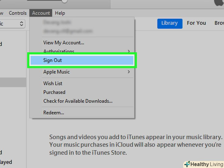 Вийдіть з поточного Apple ID. пропустіть цей крок, якщо ви не авторизувалися в Apple ID в програмі iTunes. Щоб вийти:- Натисніть "обліковий запис" у верхній частині екрана;