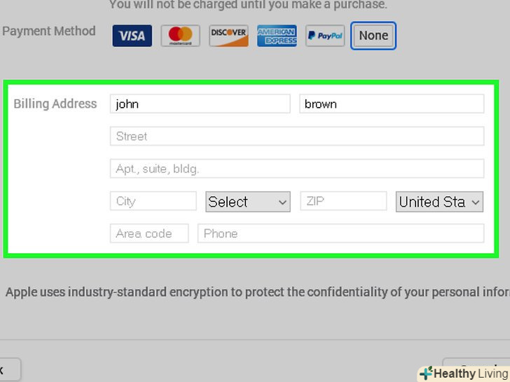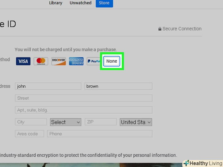 НатиснітьНемає . ця опція знаходиться в правій частині списку методів оплати, який розташований у верхній частині сторінки. Якщо даної опції немає, ви не зможете створити ідентифікатор Apple ID, не вказавши спосіб оплати, по одній з наступних причин: [2]- Ви перебуваєте не в тій країні: якщо ви перебуваєте в країні, відмінній від тієї, в якій зареєстрована ваша програма iTunes, ви не побачите опцію»ні";
