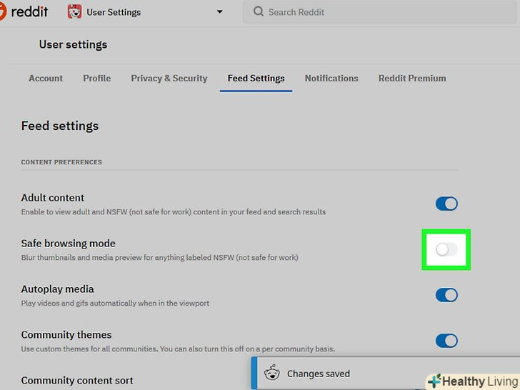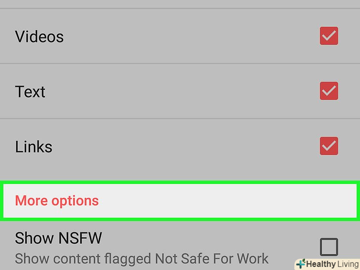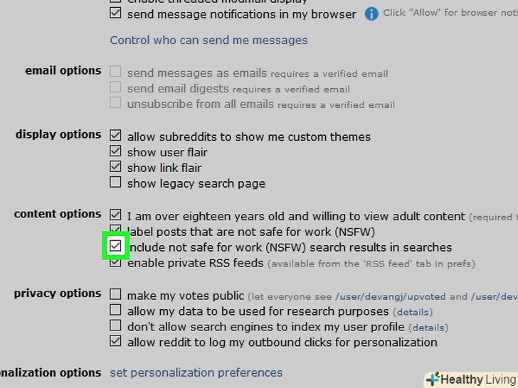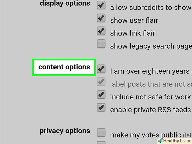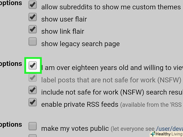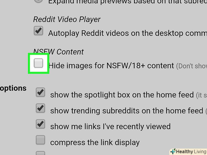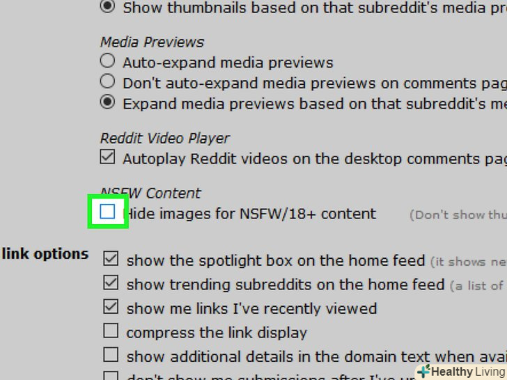 Зніміть прапорець біля "NSFW content" (NSFW-контент). ця опція знаходиться в розділі «Media» (Медіа) в першому розділі сторінки. Відтепер контент для дорослих буде відображатися у вашій стрічці Reddit і в результатах пошуку. Однак вам все одно доведеться змінити ще кілька налаштувань.
