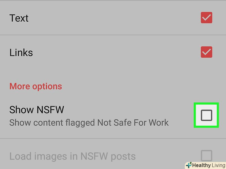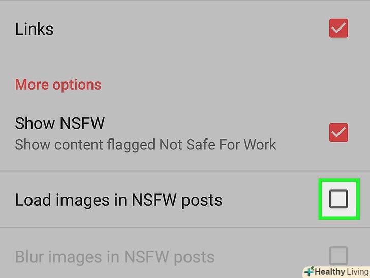 Встановіть прапорець біля «Load images in NSFW posts " (завантажувати зображення в NSFW-публікаціях) (необов'язково). активуйте цю опцію, щоб картинки завантажувалися автоматично, без необхідності торкатися їх.- Щоб NSFW-картинки завантажувалися, але залишалися розмитими до тих пір, поки ви не торкнетеся їх, встановіть прапорець у «Blur images in NSFW posts» (розмивати зображення в NSFW-публікаціях).