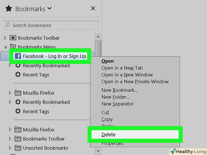 Клацніть правою кнопкою миші по закладці і в меню виберіть "Видалити". Закладка буде негайно видалена.- Клацнути правою кнопкою миші по закладці можна в меню закладок, на панелі закладок або в будь-якому іншому місці, де знаходяться закладки.