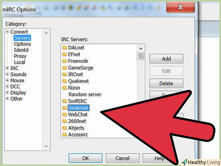 Дуже часто в програмному забезпеченні буде приставлений список одних з найпопулярніших серверів IRC в світі; ви можете до них приєднатися, якщо ще не визначилися з сервером. Назва серверів, найчастіше, говорить про тип аудиторії і користувачів, які там спілкуються. Популярні сервера (також відомі як мережі ), включають EFNet , і QuakeNet (мережа, націлена на ігрову аудиторію). Дані мережі відвідують до 100,000 користувачів протягом дня. wikiHow має IRC кімнату в мережі freenode . Ви можете під'єднатися до однієї з цих мереж, використовуючи ваш клієнт IRC. Адреси IRC мереж схожі з адресами веб-сайтів (наприклад, irc.freenode.net). виберіть сервер і натисніть на " Connect ".
