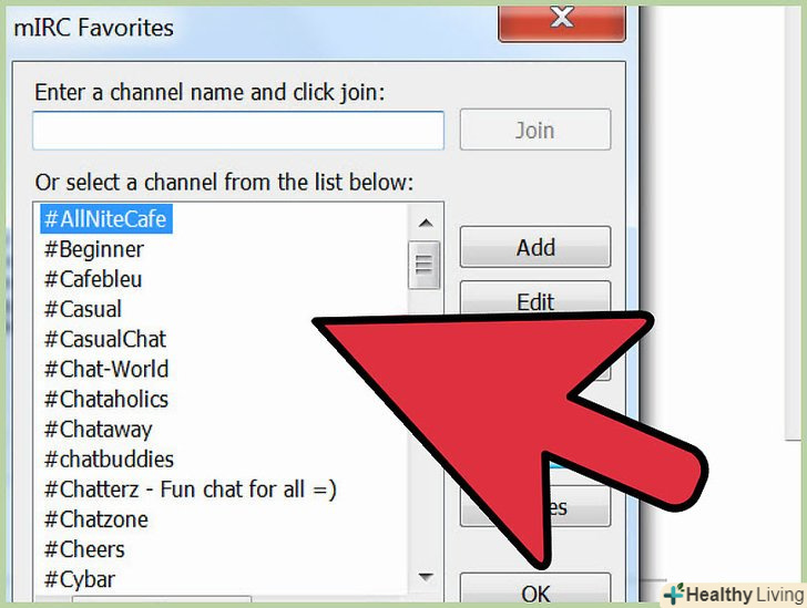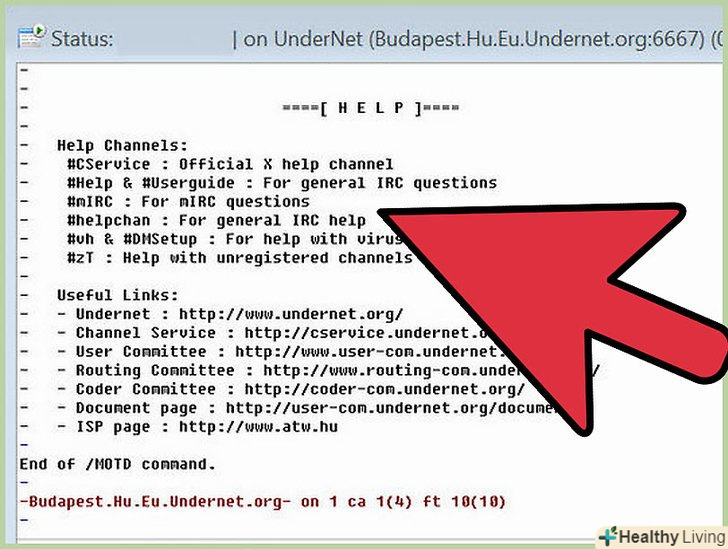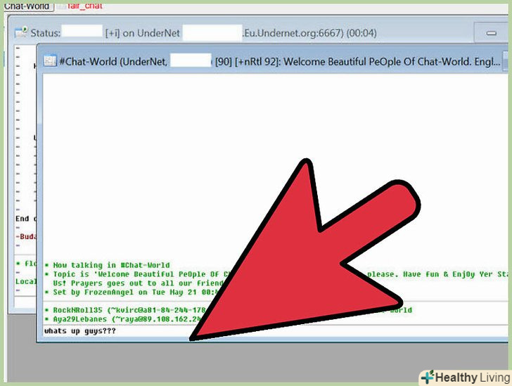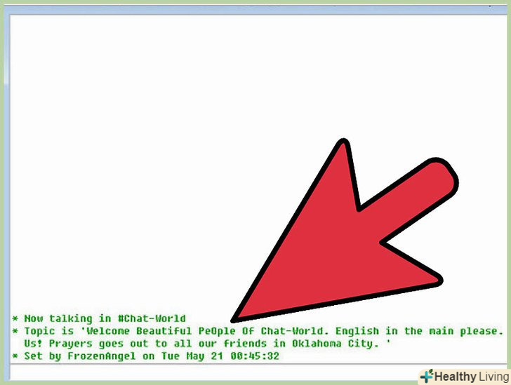 Коли ви оберете кімнату (наприклад, wikihow на irc.freenode.net), ви зможете приєднатися до неї, написавши /join channelname в поле для введення. якщо ви не можете знайти кімнату, то спробуйте зайти на канал допомоги (help), який присутній на більшості серверів.
