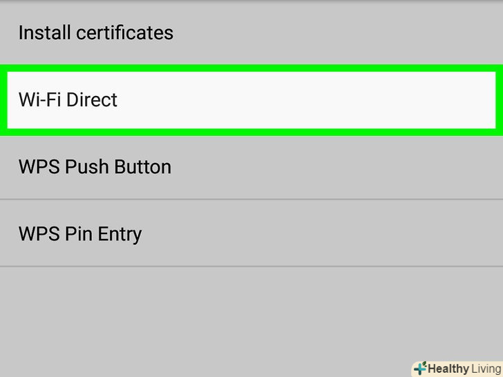 Натисніть наWi-Fi Direct з цього меню. Ваше оточення буде проскановано, після чого відобразяться всі пристрої, до яких можна підключитися через Wi-Fi Direct.- Кнопка Wi-Fi Direct може знаходитися в нижній частині екрана на сторінці Wi-Fi, а не в випадаючому меню. Це залежить від моделі вашого пристрою та поточної версії програмного забезпечення.