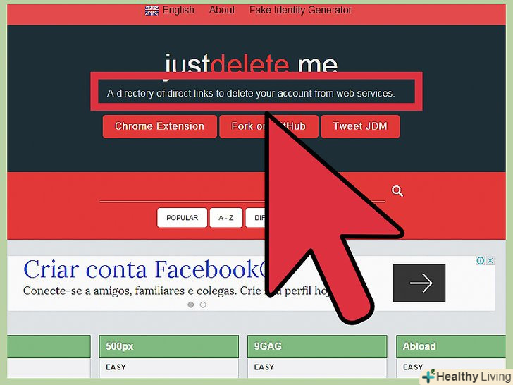 Видаліть свої облікові записи. Як вже говорилося, можливо, ви не пам'ятаєте всіх сайтів, на яких зареєстровані. Чим популярніший сайт, тим ефективніше видалення своєї особистої інформації з нього, якщо ви намагаєтеся зникнути з Інтернету. Це необов'язково очистить пам'ять» глибокої павутини " про вас, але це гарний початок. Наступний список повинен допомогти Вам у визначенні першочергових завдань:- видаліть себе з Facebook .