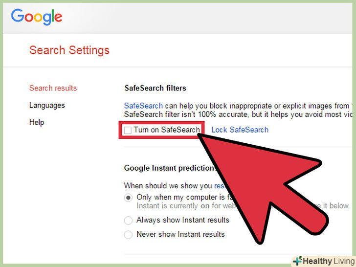 Увімкніть Безпечний пошук. у верхній частині сторінки «Налаштування пошуку» розташована опція «Безпечний пошук». Відзначте прапорцем комірку, де сказано «»блокувати неприйнятний контент". Так ви заблокуєте весь порнографічний контент в результатах пошуку Google.