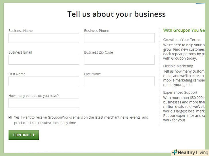 Заповніть реєстраційну форму. там розташована невелика форма, за допомогою якої Ви можете представити свою компанію в Groupon. Вона поділена на секції:- Персональна інформація. Тут заповнюють дані вашої головної контактної особи для зв'язку з командою продажів і маркетингу Groupon. Поля з зірочкою обов'язкові до заповнення.