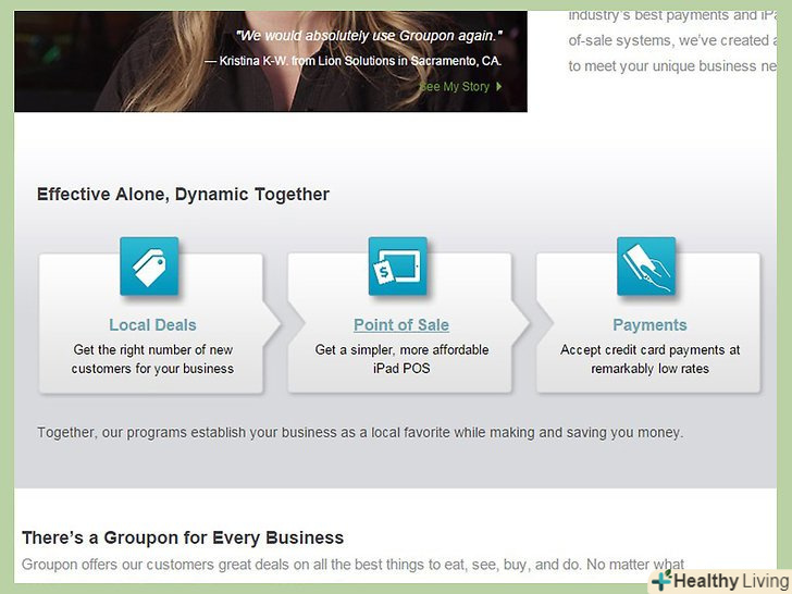 Зайдіть на сайтGroupon Works . у той час як звичайні сторінки Groupon спрямовані на споживача, Groupon Works створений для підприємців.- Подивіться відгуки і зрозумійте як Groupon може допомогти вашому бізнесу.