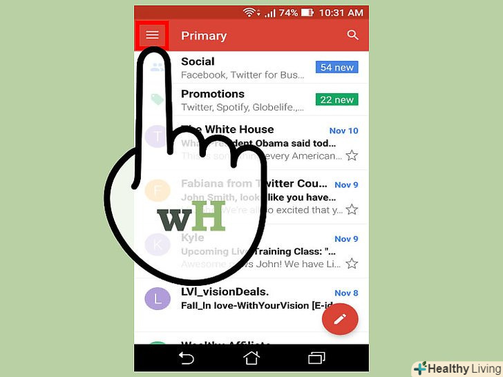Запустіть програму Gmail. відкриється остання папка Gmail, в якій ви працювали. Щоб перейти в іншу папку, натисніть кнопку "Меню" (значок у вигляді трьох горизонтальних ліній) в лівому верхньому кутку екрану.