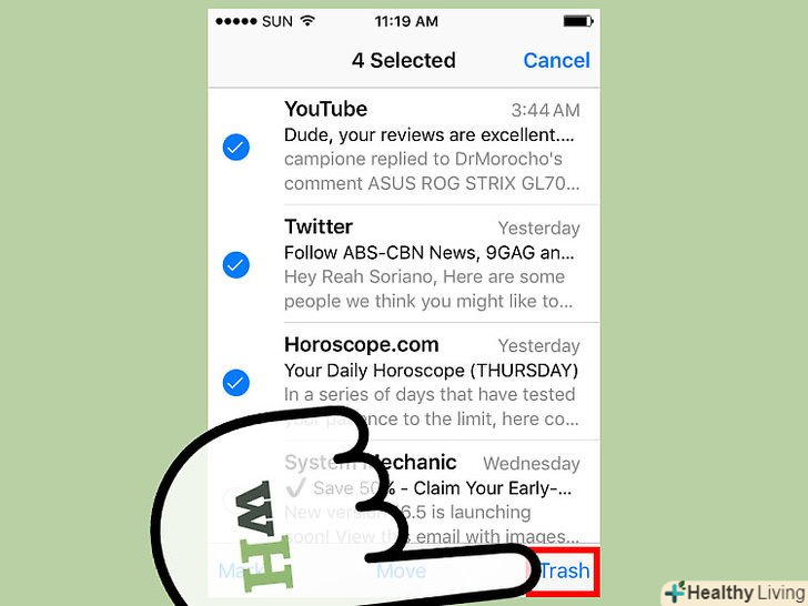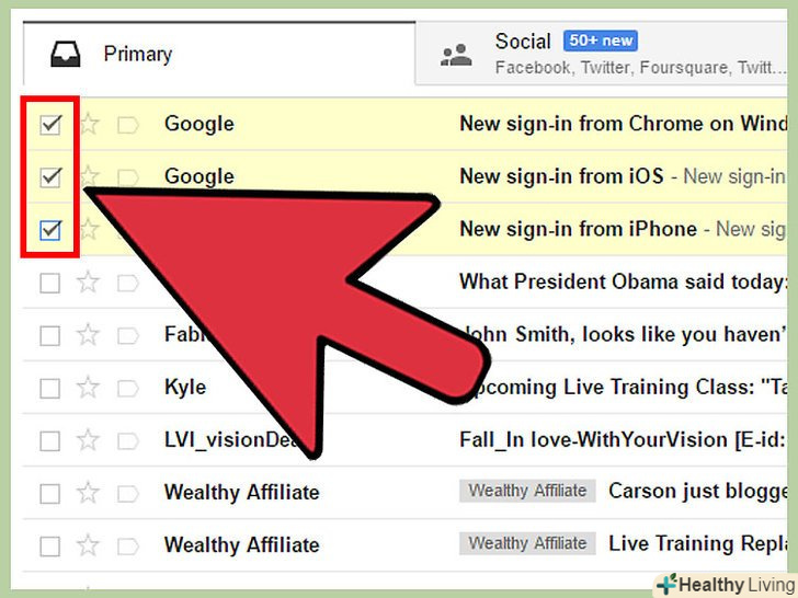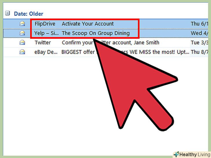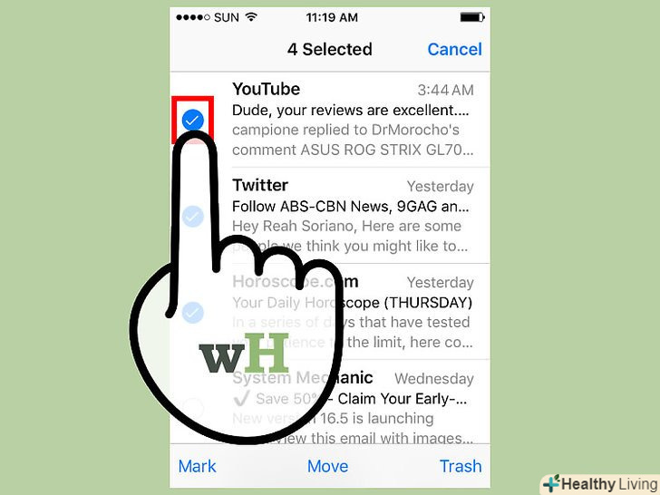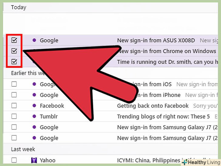 Встановіть прапорець зліва від кожного листа, який хочете заархівувати. [4]- Також можна утримуватиControl і натиснути A , щоб вибрати Всі листи в поштовій скриньці.