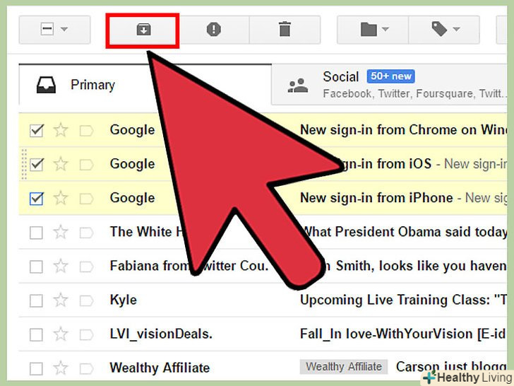 Натисніть "Архівувати". цей значок у вигляді спрямованої вниз стрілки знаходиться вгорі сторінки. Вибрані листи будуть відправлені в архів і видалені з вашої поштової скриньки.