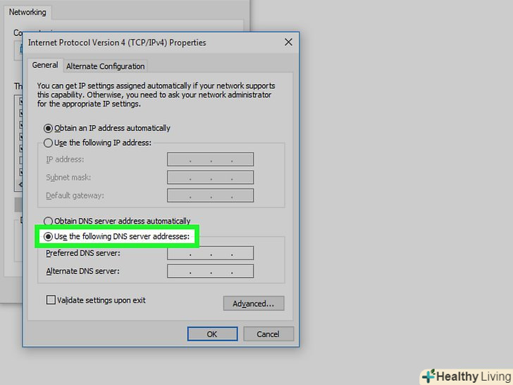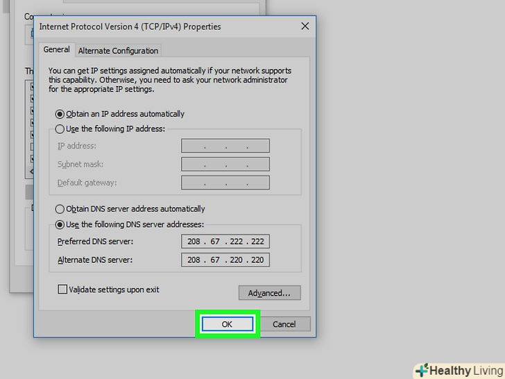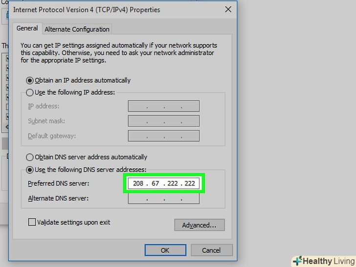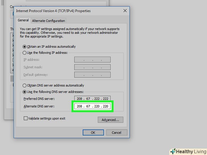 Введіть альтернативну адресу. зробіть це в рядку «альтернативний DNS-сервер» в нижній частині вікна. Тут введіть наступні адреси (вони повинні відрізнятися від адрес, введених в рядку "бажаний DNS-сервер"»:- OpenDNS: введіть 208.67.220.220 ;
