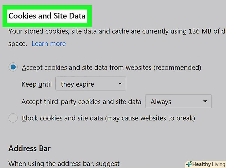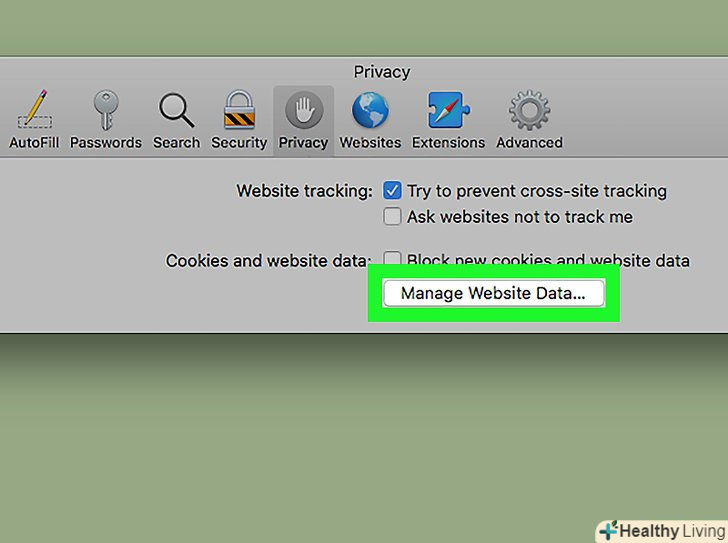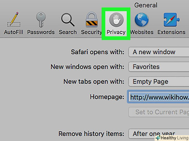 Відкрийте вкладку «Конфіденційність». вона знаходиться у верхній частині вікна «Налаштування». На цій вкладці можна очистити кеш і файли куки. [5]