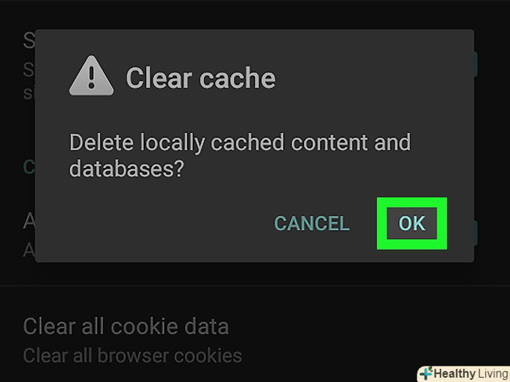 Натисніть «ОК", щоб підтвердити очищення. вітаємо, ви очистили кеш і файли куки браузера!- Щоб зміни вступили в силу, закрийте браузер на телефоні і повторно його запустіть.