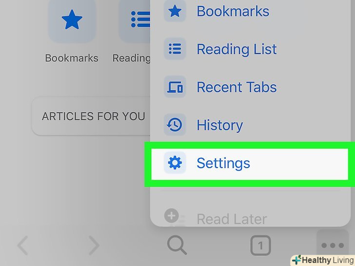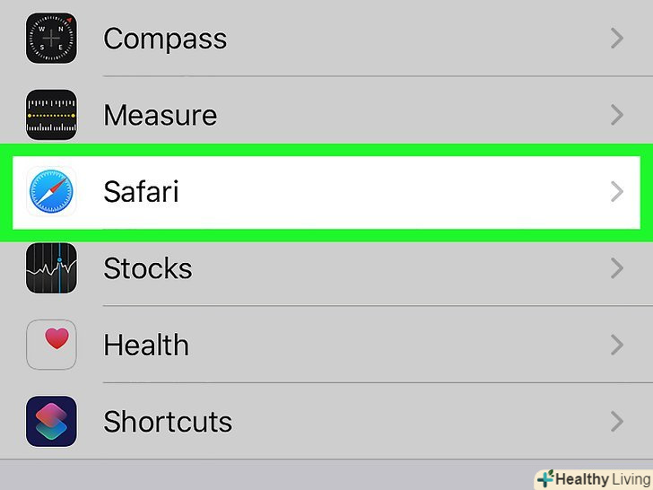 Прокрутіть вниз і натиснітьSafari . ця опція відзначена значком у вигляді синього компаса. Відкриються Налаштування Safari.