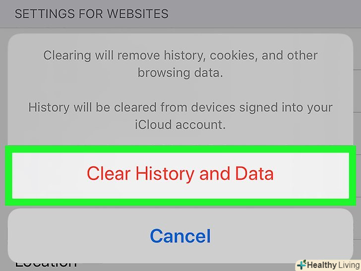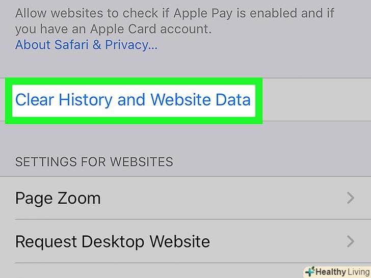 Прокрутіть вниз і натиснітьОчистити історію та дані веб-сайтів . ця опція розташована в нижній частині налаштувань Safari.