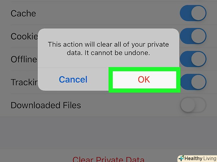 НатиснітьОчистити дані (Android) або Ok (iPhone/iPad). так ви підтвердите, що хочете Очистити дані браузера.